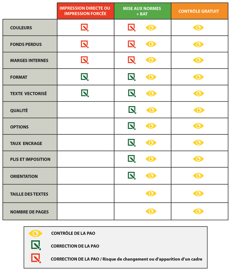 Lors du contrôle, nous vérifions la colorimétrie, la qualité du rendu, le format, les fonds perdus et marges de sécurité, la vectorisation des textes et pour les produits plus complexes, les zone des plis etc… (voir partie « Normalisation » plus bas)